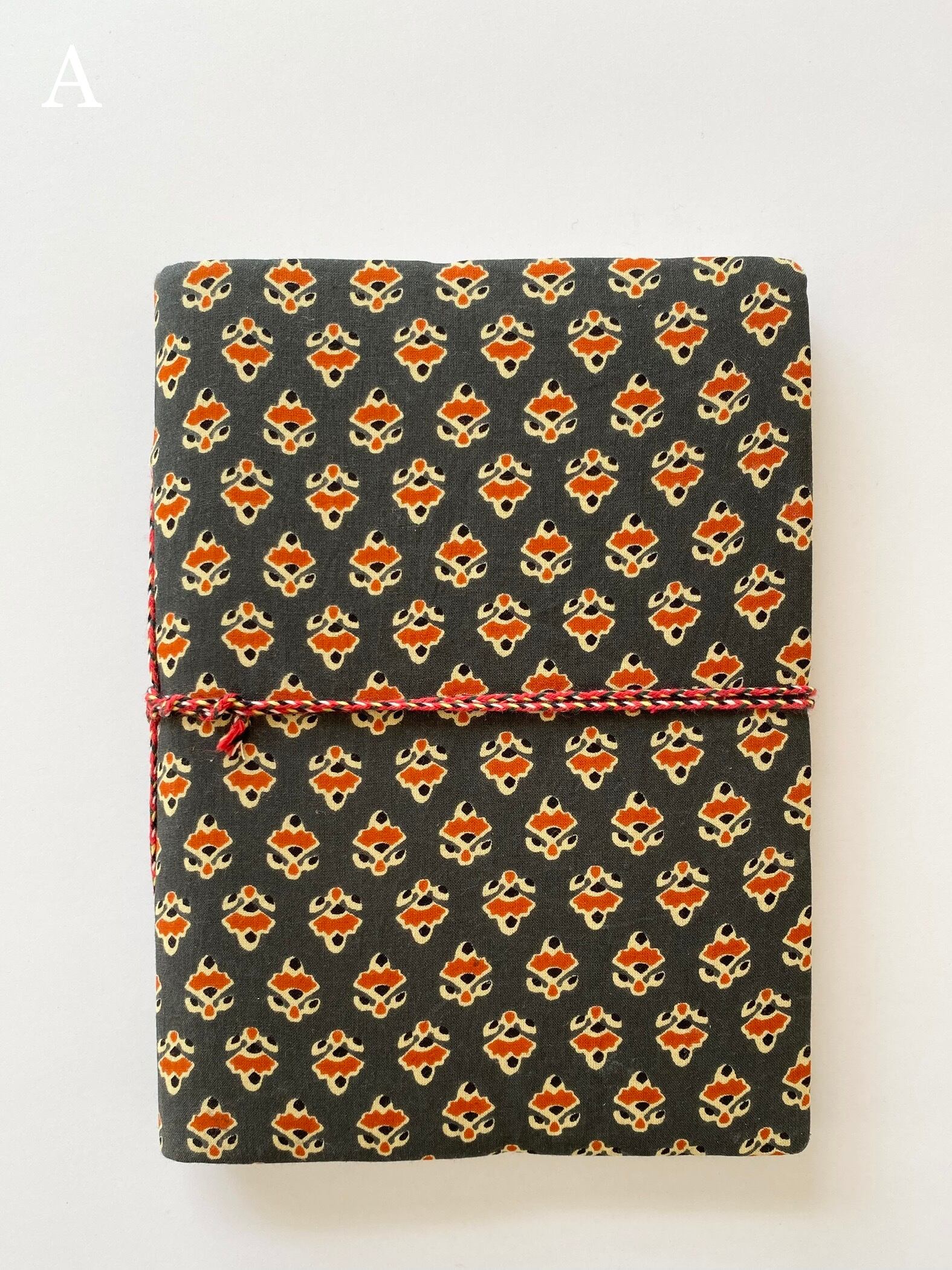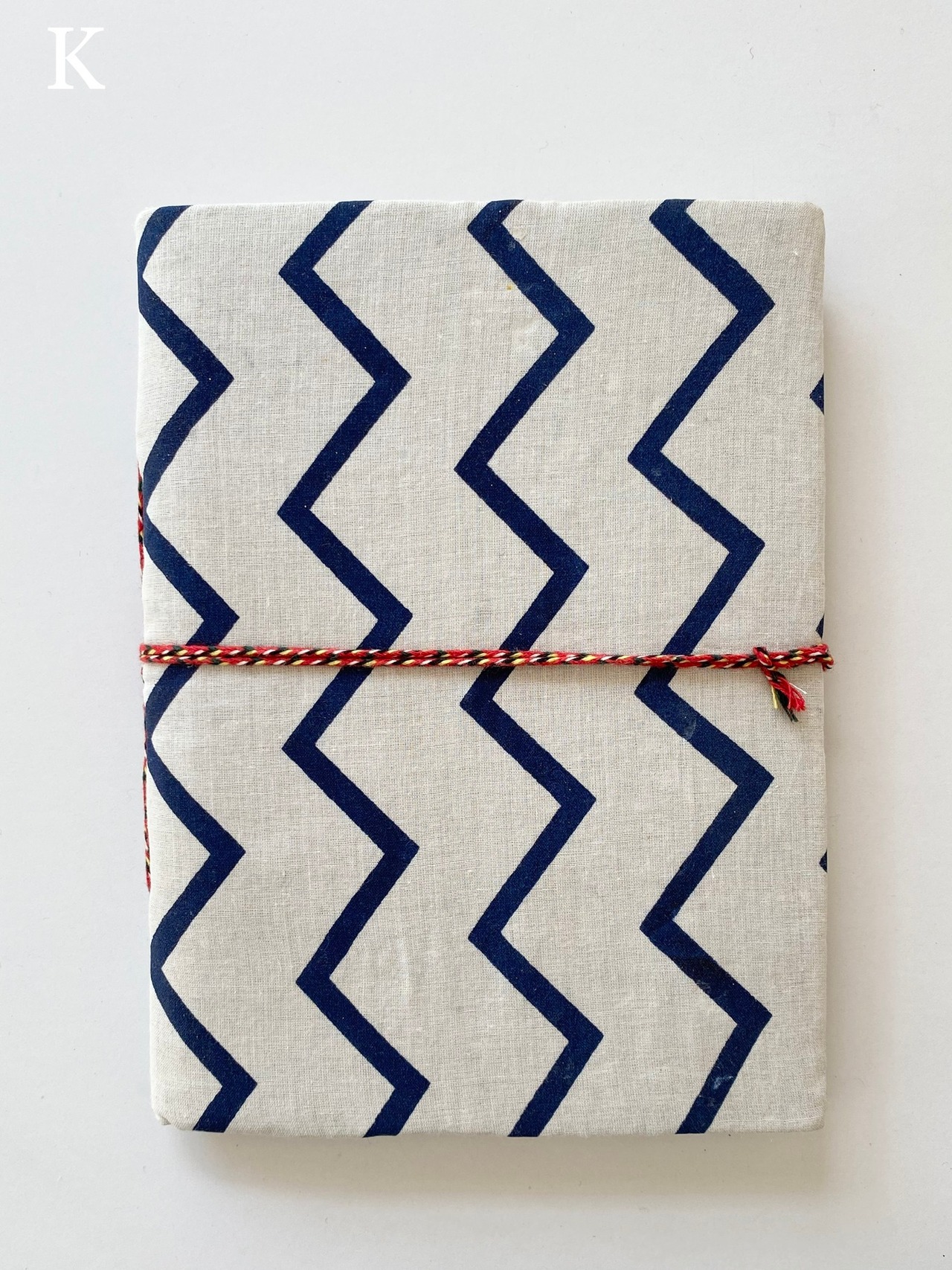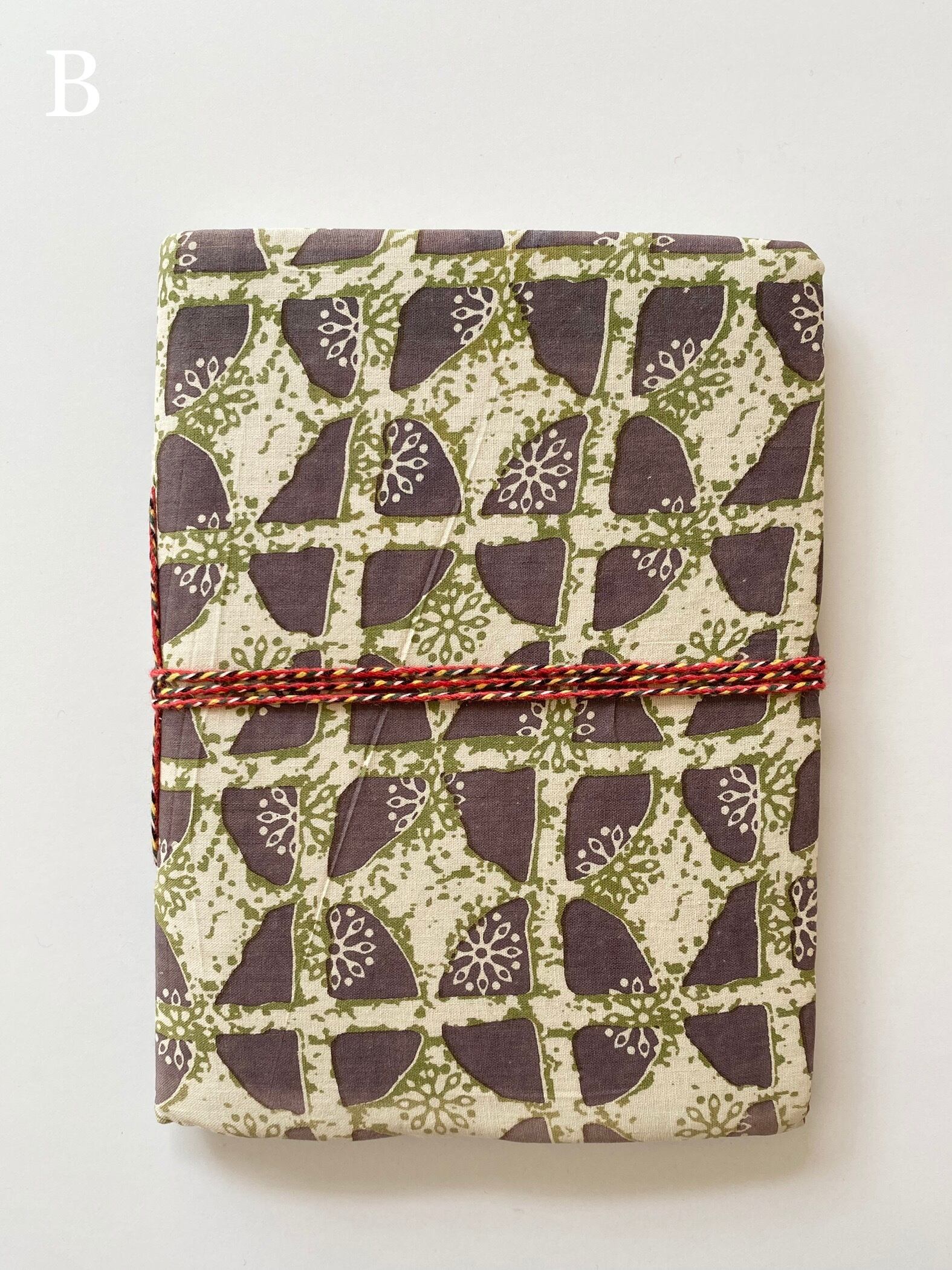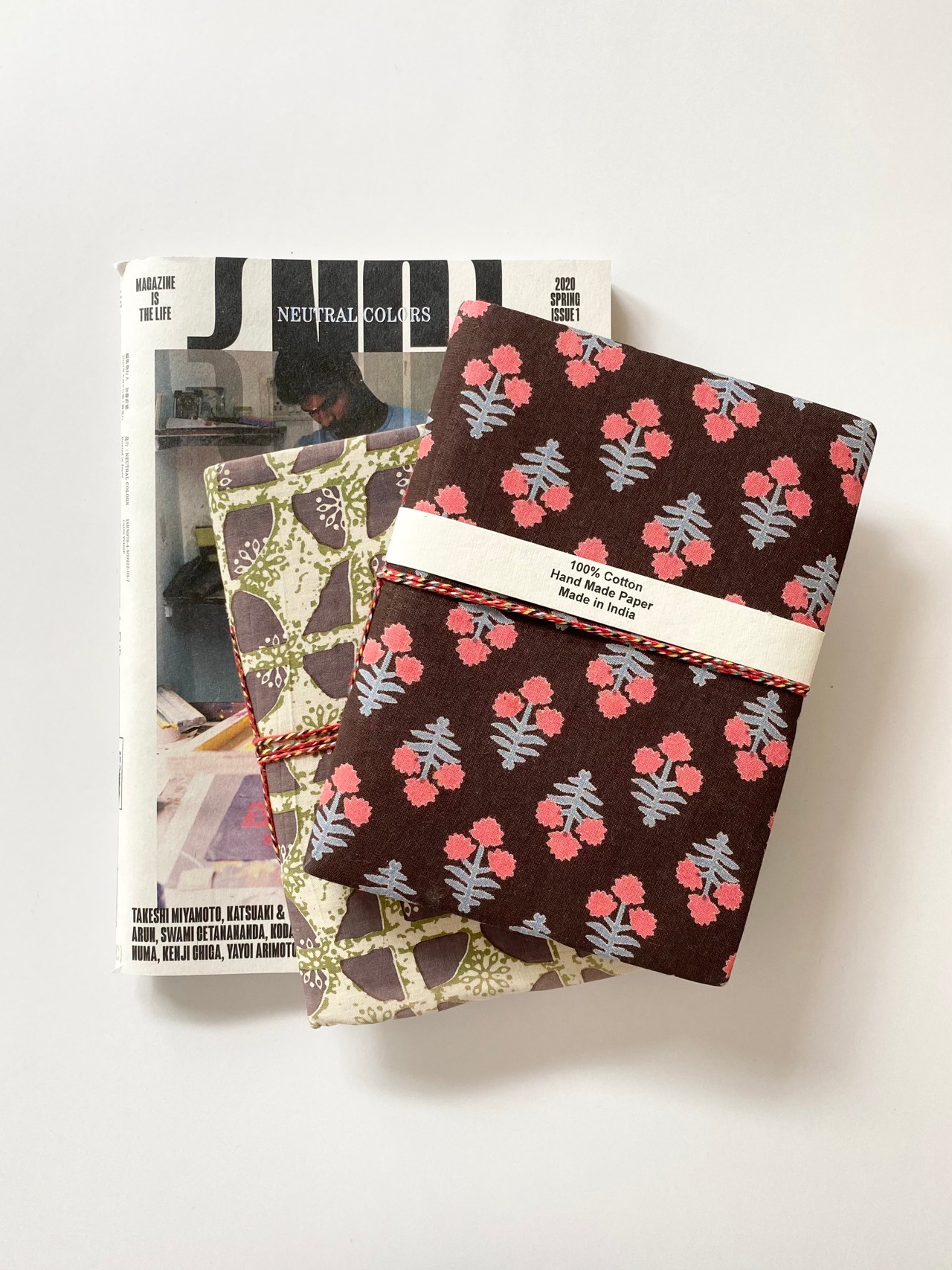 カバーはブロックプリント、中はコットンをリサイクルした手漉きの紙を紐で閉じた、オールハンドメイドのノートです。少し厚みや凹凸があり手触りが良く、漂白された紙とはひと味違う温もりを感じます。